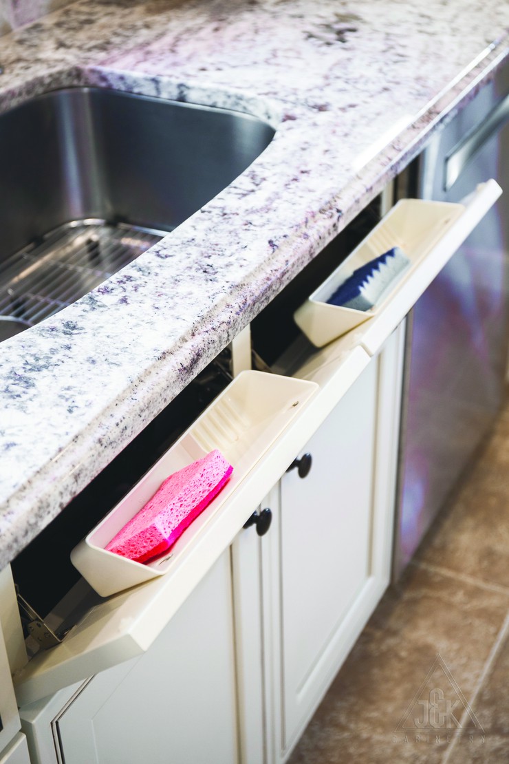 Discover delightful hidden conveniences in our sink cabinets, including trays with a ring holder and soap dish.